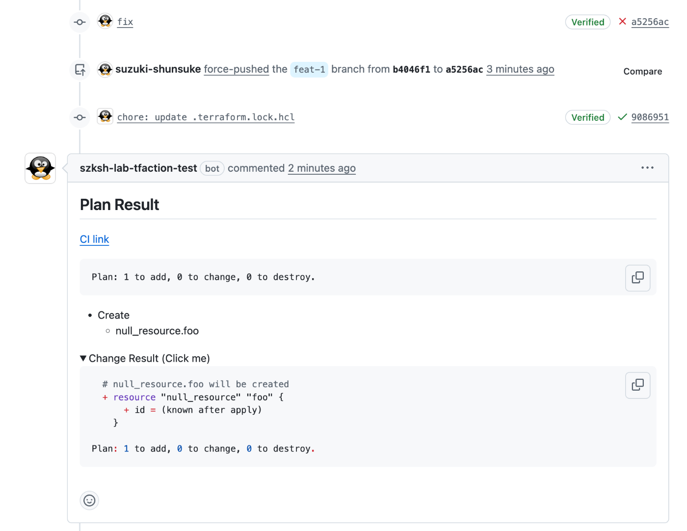 The result of terraform plan will be commented on the PR using tfcmt.