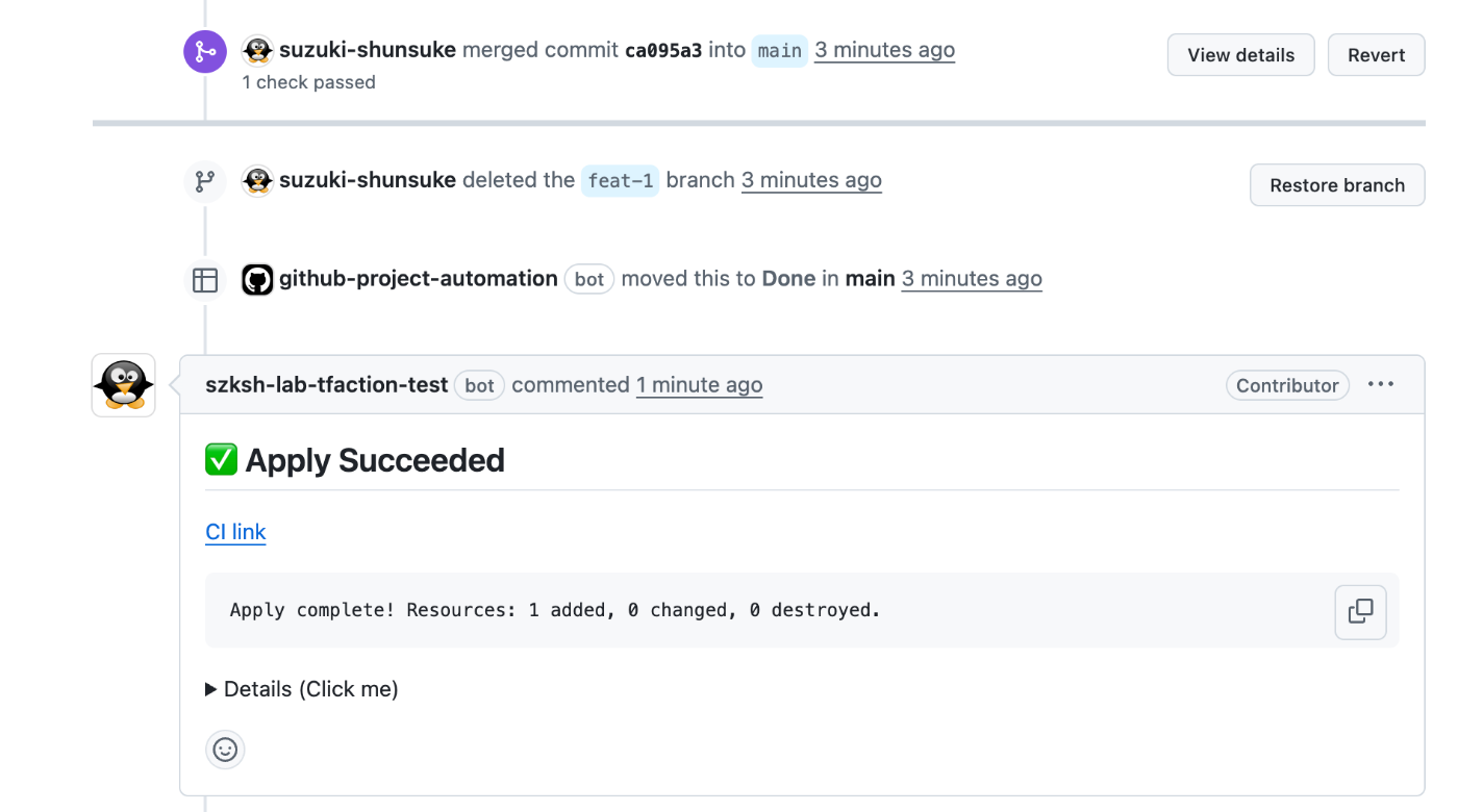 After merging, terraform init and apply will run, and the results will be posted as a PR comment.