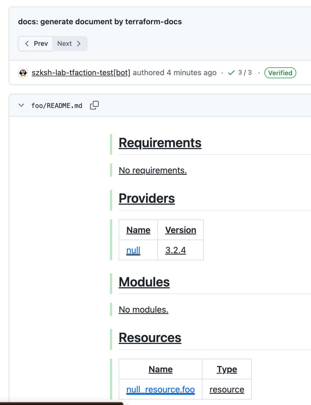 Documentation is automatically generated and updated. tfaction installs terraform-docs automatically.